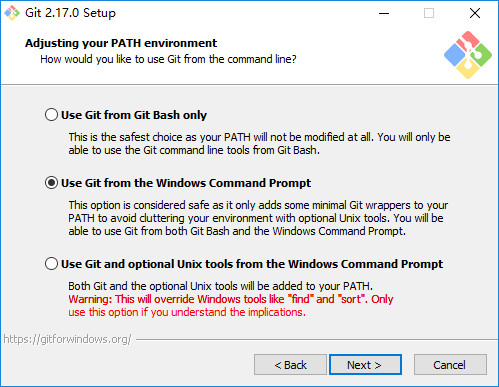 This option is considered safe as it only adds some minimal Git wrappers to your PATH to avoid cluttering your environment with optional Unix tools . You will be able to use Git from both Git Bash and the Windows Command Prompt.