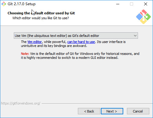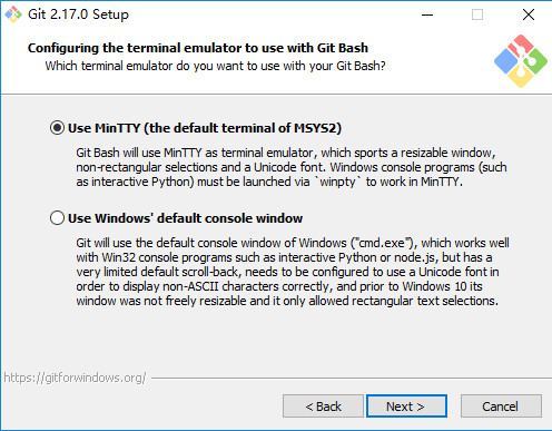 Git将使用Windows的默认控制台窗口(“cmd.exe”),该窗口可以与Win32控制台程序(如交互式Python或node.js)一起使用,但默认的回滚非常有限,需要配置为使用unicode 字体以正确显示非ASCII字符,并且在Windows 10之前,其窗口不能自由调整大小,并且只允许矩形文本选择。