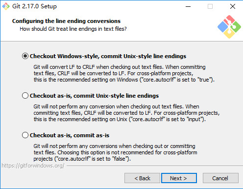 Git will not perform any conversions when checking out or committing text files.Choosing this option is not recommended for cross-platform projects ("core.autocrlf"is set to "false")